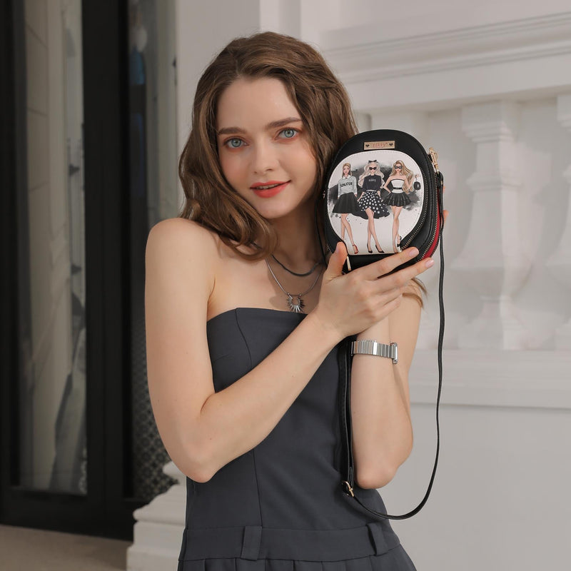 Nikky in gold tone on the front - Rings on the sides to attach an optional cross-body strap