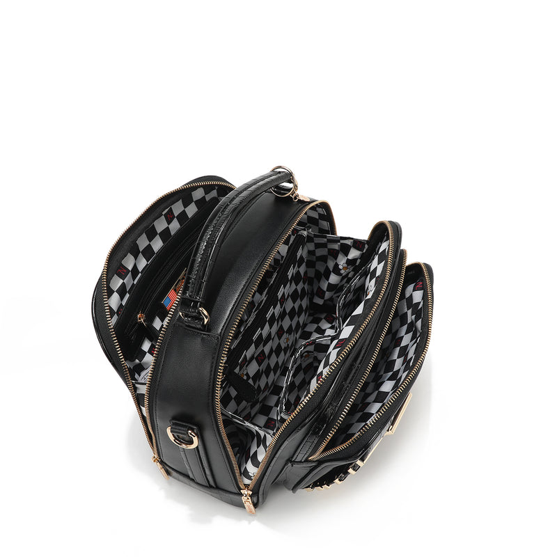 - Rear interior zippered pocket with logo plaque and keyring strap