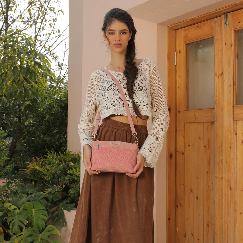 - Diseño calado con flores y monograma, adornado con pedrería tipo diamante