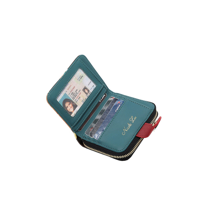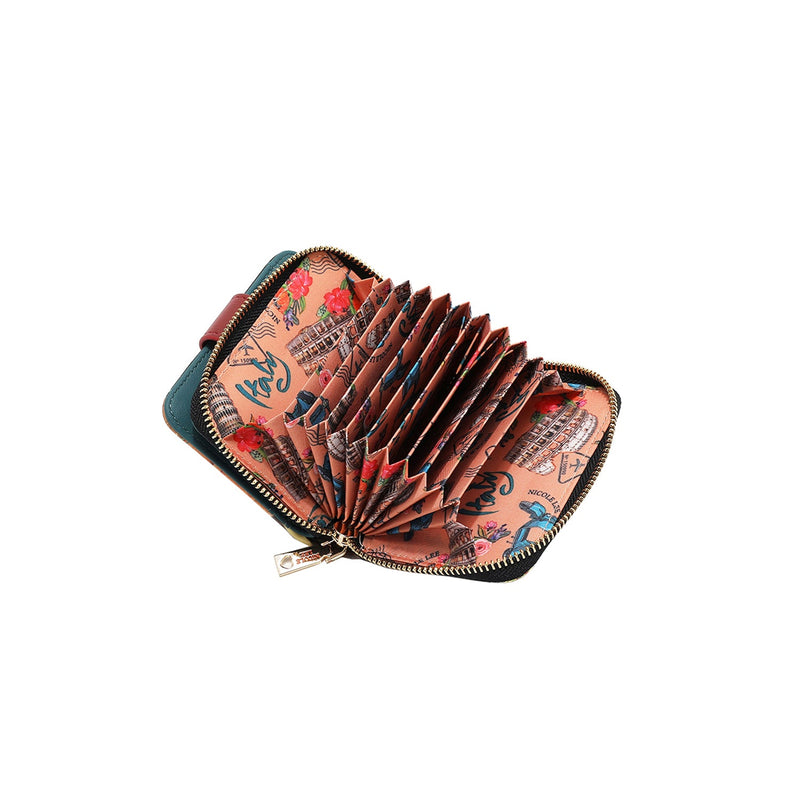 - El compartimento trasero se abre con cremallera a 2 ranuras interiores para notas y 9 ranuras para tarjetas de estilo acordeón (puede contener hasta 25 tarjetas)